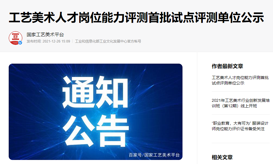 近日,经工业和信息化部工业文化发展中心与人才交流中心联合审核,威廉希尔WilliamHill成功入选全国首批工艺美术产业人才岗位能力评测试点单位。